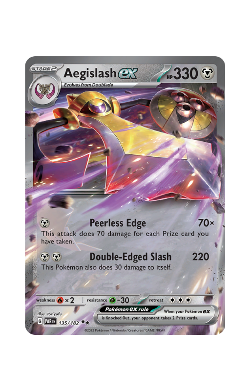 Oryginalna karta Pokemon Aegislash ex z setu Pokémon Paradox Rift o skróconej numeracji PAR 135.