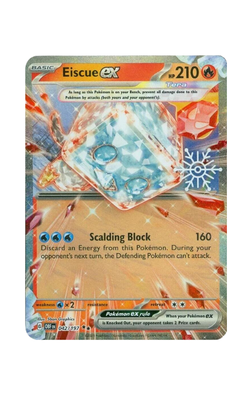 Oryginalna karta Pokemon Eiscue ex z setu Pokémon Obsidian Flames o skróconej numeracji OBF 042 z stemplem płatka śniegu pochodzący z produktu Holiday Calendar 2024.