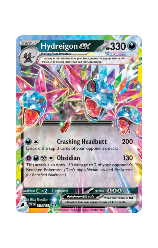 Oryginalna karta Pokemon Hydreigon ex z setu Pokémon Surging Sparks o skróconej numeracji SSP 119.