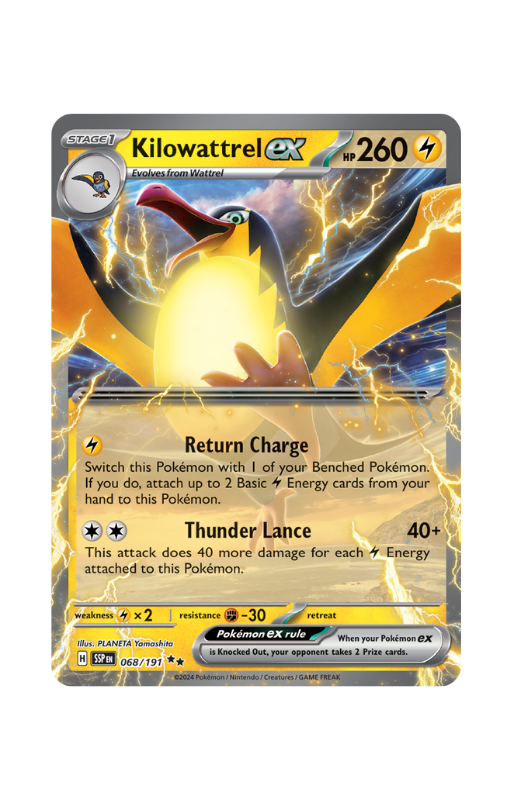 Oryginalna karta Pokemon Kilowattrel ex z setu Pokémon Surging Sparks o skróconej numeracji SSP 068.