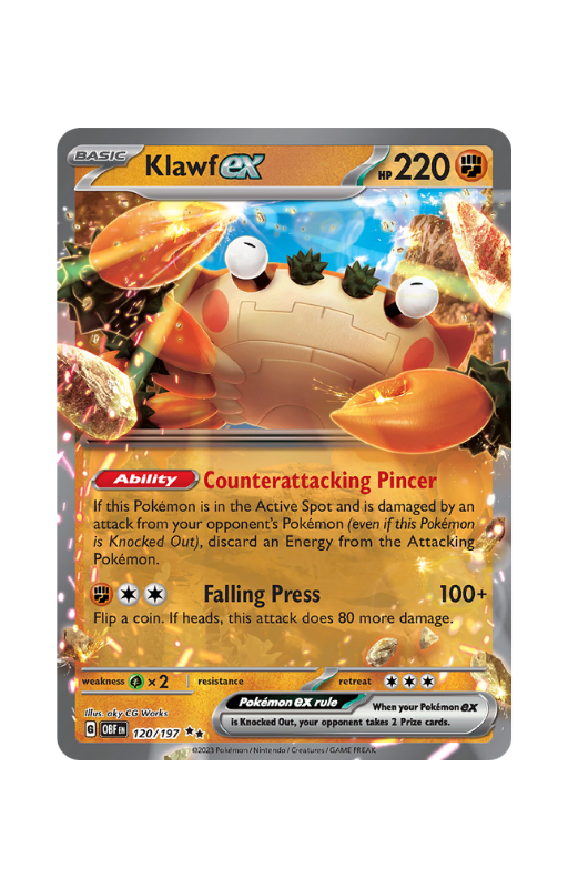 Oryginalna karta Pokemon Klawf ex z setu Pokémon Obsidian Flames o skróconej numeracji OBF 120.