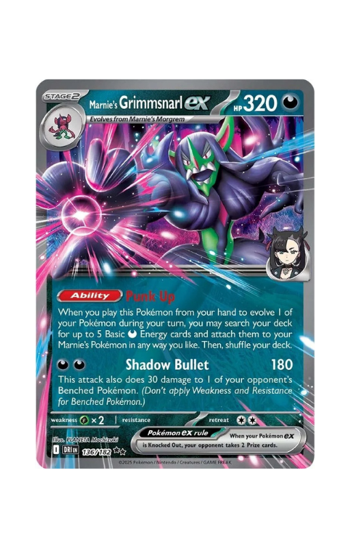Oryginalna karta Pokemon Marnie's Grimmsnarl ex z setu Pokémon Destined Rivals o skróconej numeracji DRI 136.