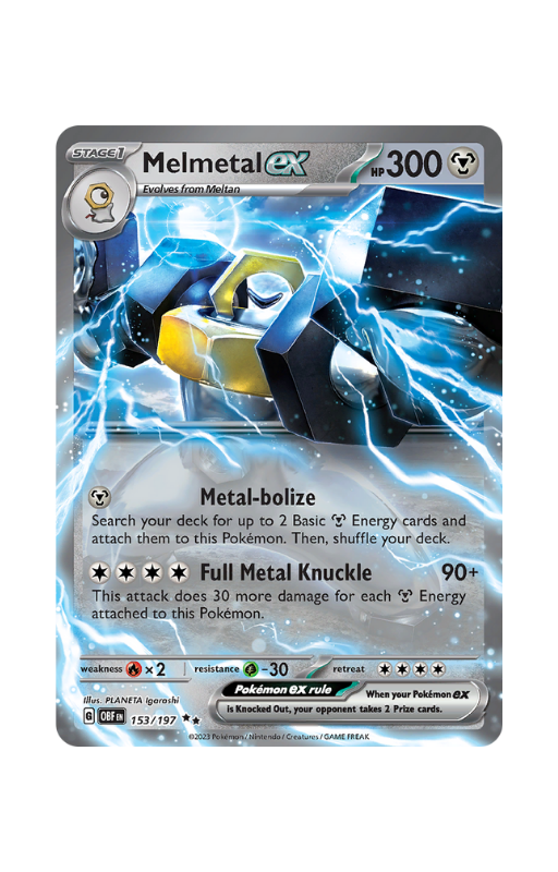 Oryginalna karta Pokemon Melmetal ex z setu Pokémon Obsidian Flames o skróconej numeracji OBF 153.