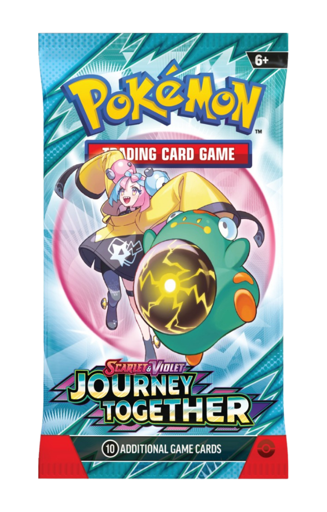 Booster z 10 losowymi kartami z dodatku Journey Together (JTG), kartą energii oraz kartą z kodem do gry Pokemon TCG Live.